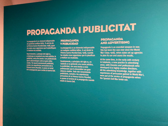 Bloc 1: El primer bloc es remunta uns anys enrere, a principis de segle XX, i apunta la importància del desenvolupament de la publicitat a Catalunya i com les tècniques i el coneixement d’aquesta es van incorporar a la propaganda en esclatar el conflicte bèl·lic.